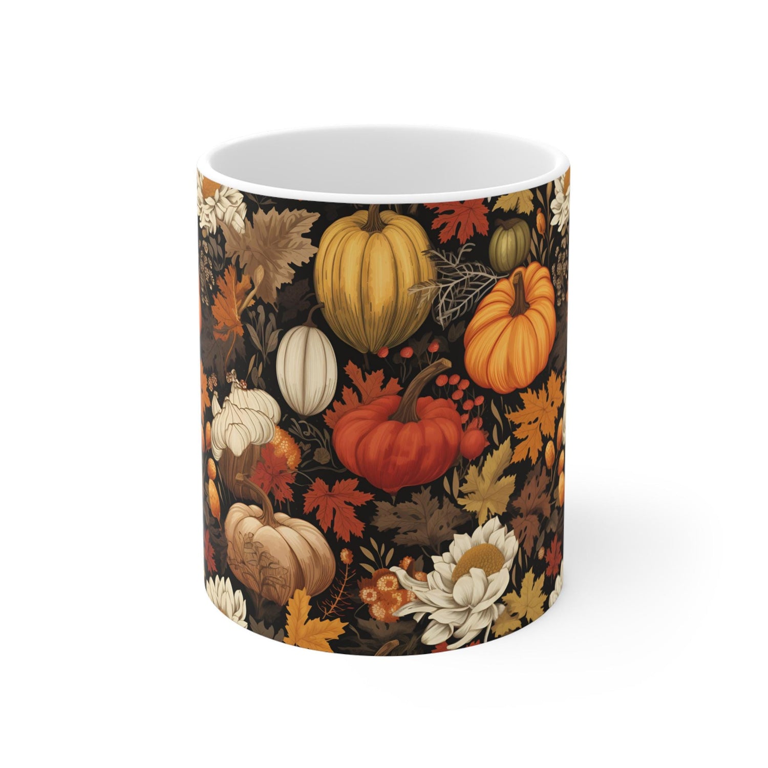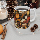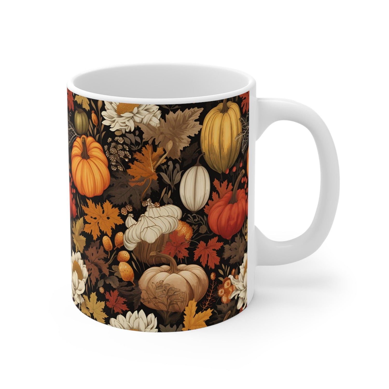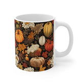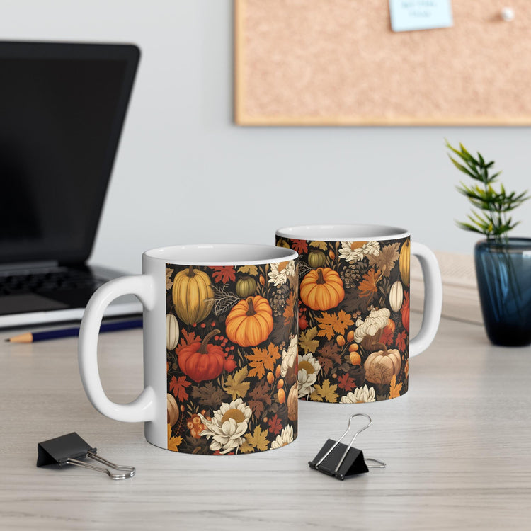 Introducing this beautiful 11oz Mug, perfect for enjoying your favorite beverages while celebrating the warmth of the season. The intricate design features vibrant pumpkins and fall foliage, evoking a cozy autumn atmosphere. Ideal for sipping pumpkin spice lattes or warm apple cider, this mug is not just a practical item but also a statement piece for any kitchen or home office. It's a thoughtful gift for friends, family, or colleagues who appreciate seasonal decor or love cozy evenings. Perfect for Halloween, Thanksgiving, or any fall gathering, this mug brings a touch of seasonal cheer to everyday moments.