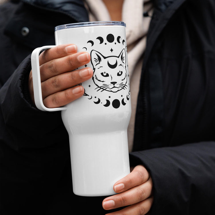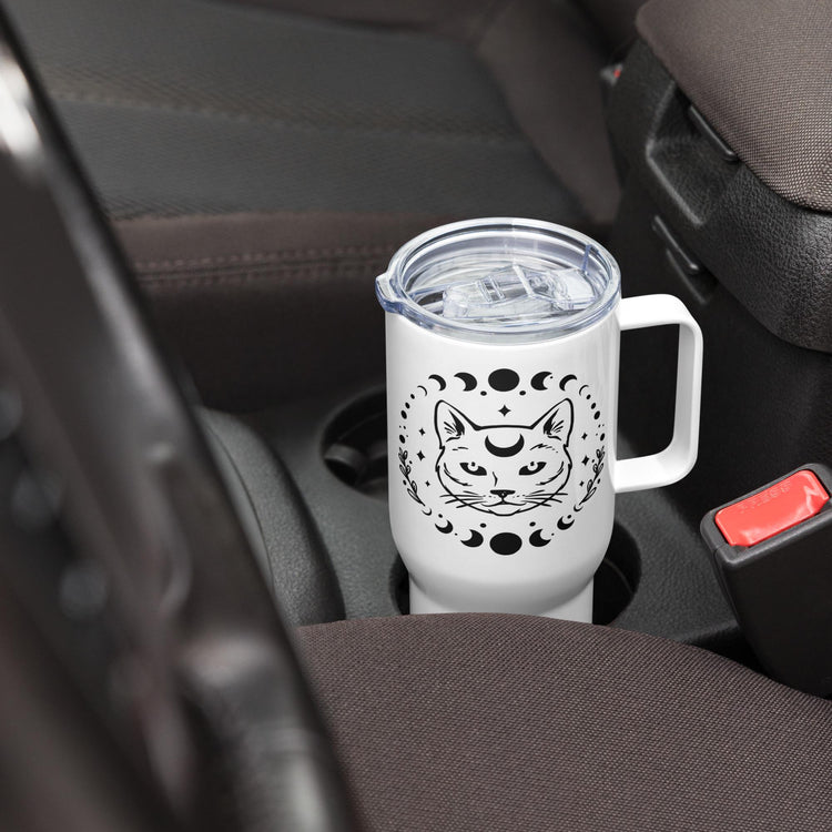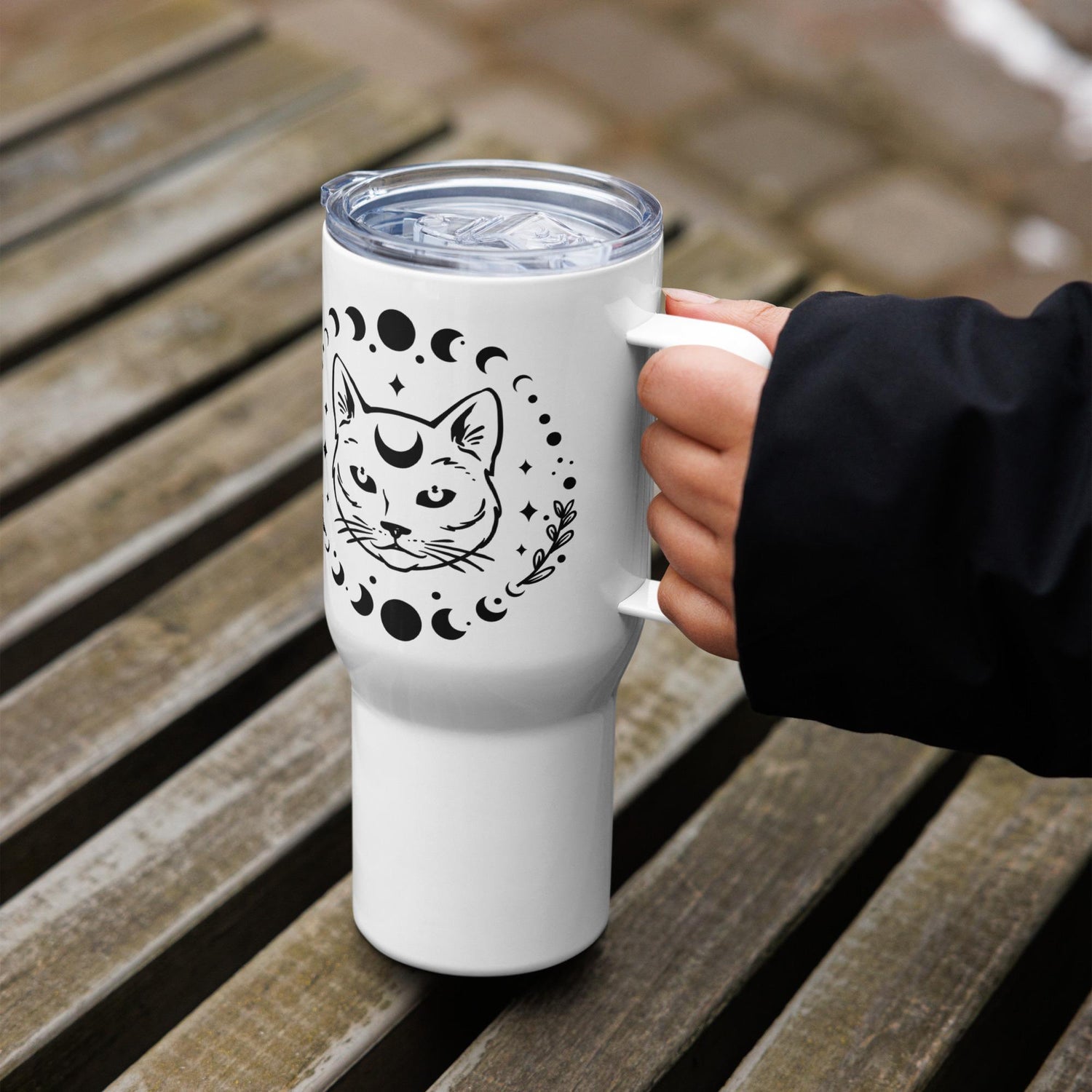 Travel mug with a handle, Celestial cat and moon design everyday sturdy sleek coffee water car travel mug