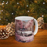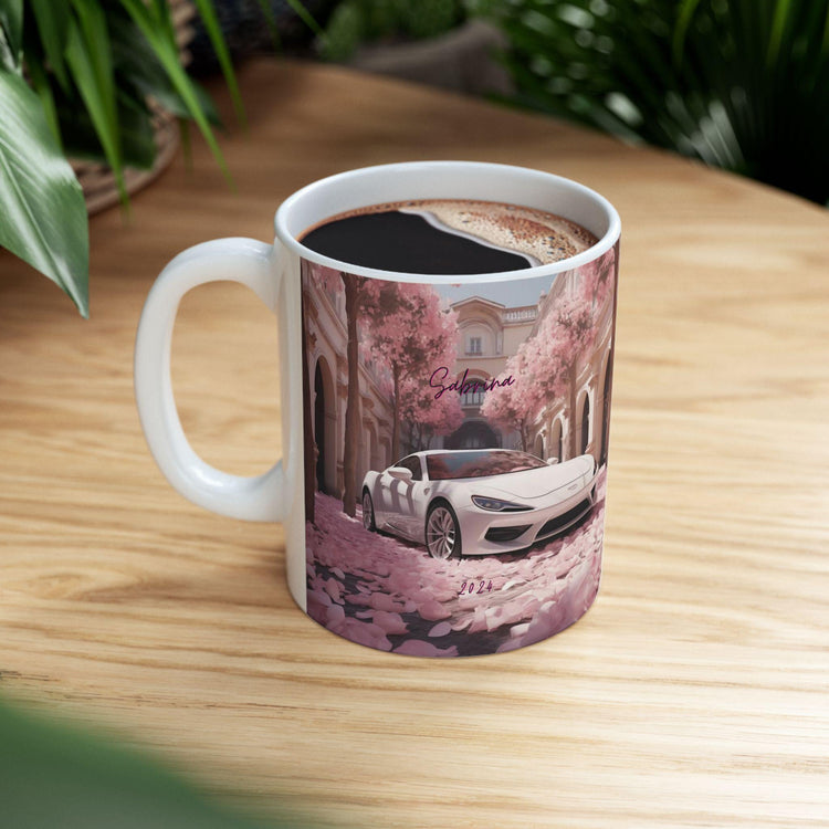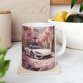 Artistic exotic car design ceramic mug, featuring a personalized white sexy Lamborghini. Perfect gift idea for car lovers, adding a touch of fancy to your morning coffee routine. Relevant for car enthusiasts, birthdays, Father's Day, or any special occasion.