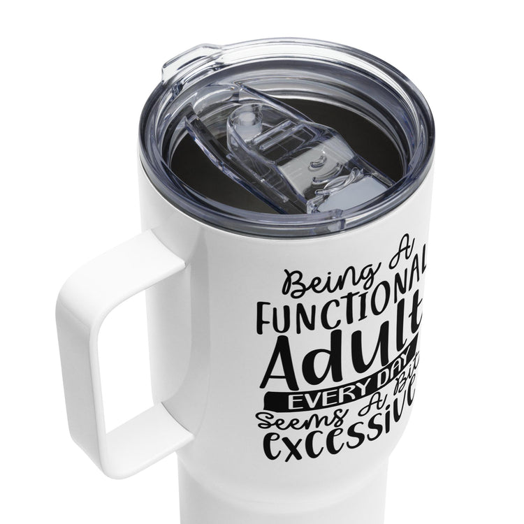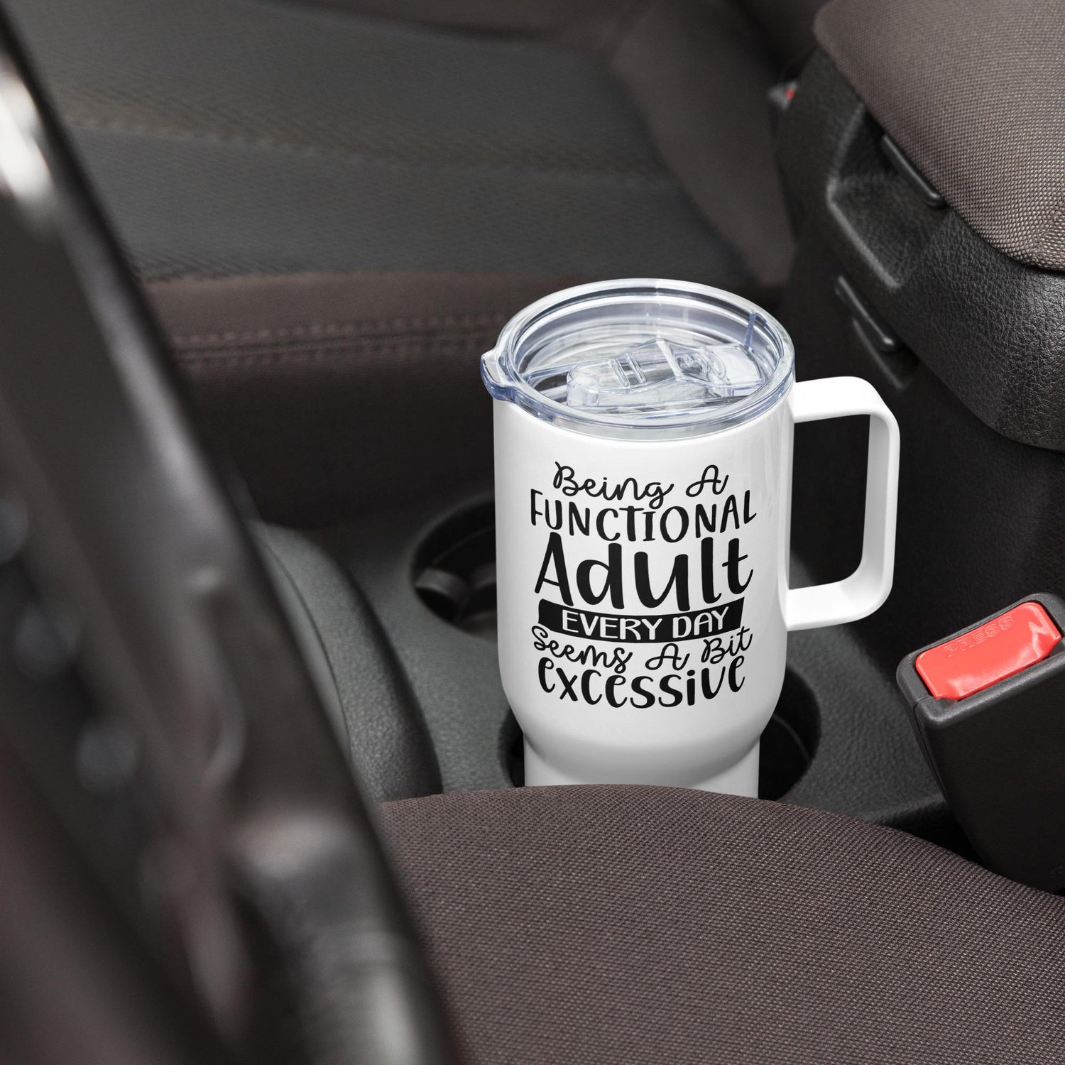Travel mug with a handle, humorous funny silly saying elevated 25 oz spill proof sturdy strong BPA free coffee water drink car travel cup