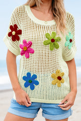 Delicate crochet flower patterns dance across this airy white tee, blending sweater comfort with playful hollow-out details. Perfect for sunny brunches or beach strolls, this versatile top adds a touch of whimsy to any outfit. Layer it or rock it solo – either way, you'll bloom with style!