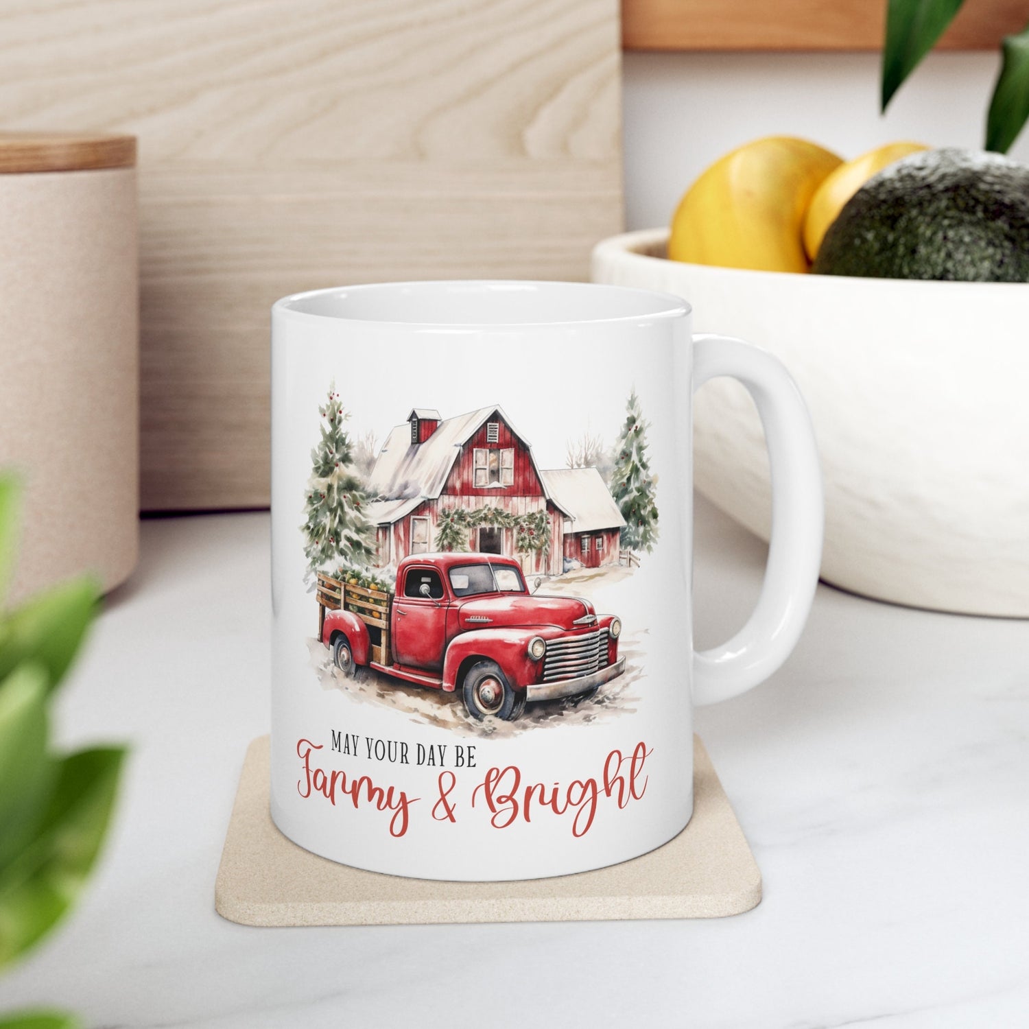 Enjoy your morning coffee in this Farm House Design Ceramic Mug 11oz. Perfect for the holiday season, this Xmas mug is a great gift for dad or anyone who loves cozy kitchen decor. The vibrant colors and glossy finish make it a festive addition to your home.