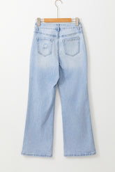 Step into retro vibes with these Beau Blue Vintage Light Wash Distressed Flare Jeans. Featuring a playful flare and charming distressed details, they bring a fun, carefree spirit to your wardrobe. Perfect for adding a splash of vintage cool to any outfit!