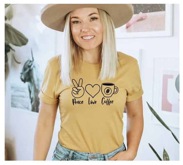 Peace Love Coffee T-shirt, Love Coffee Shirt, Coffee Gift, Birthday Tee, Summer Top, Women's Shirts, Hippie Gift, Vegan T-shirt, Mom Tee