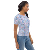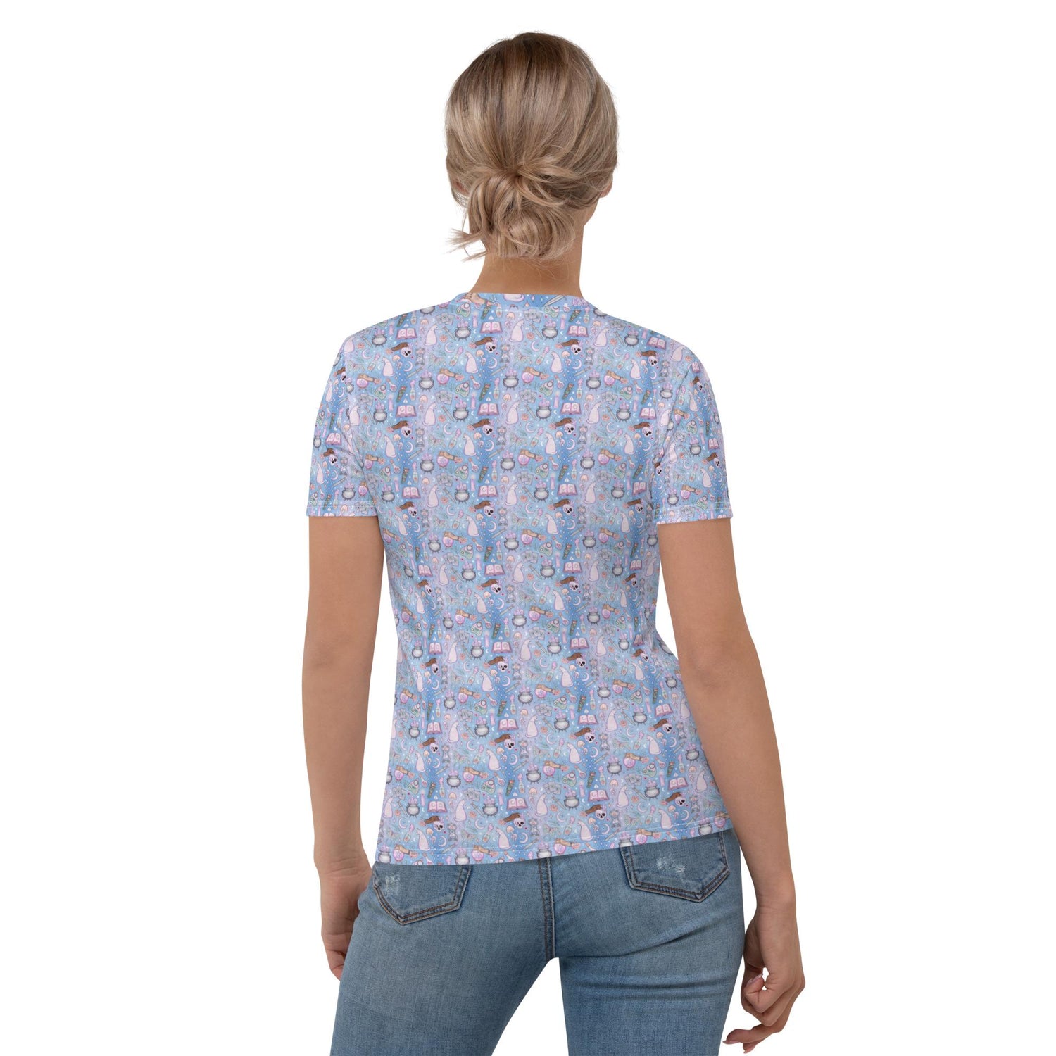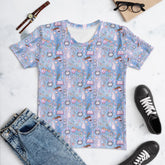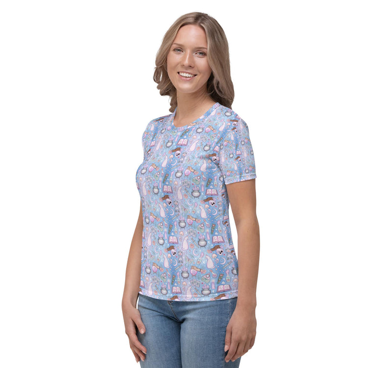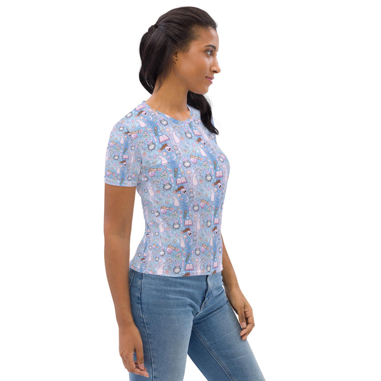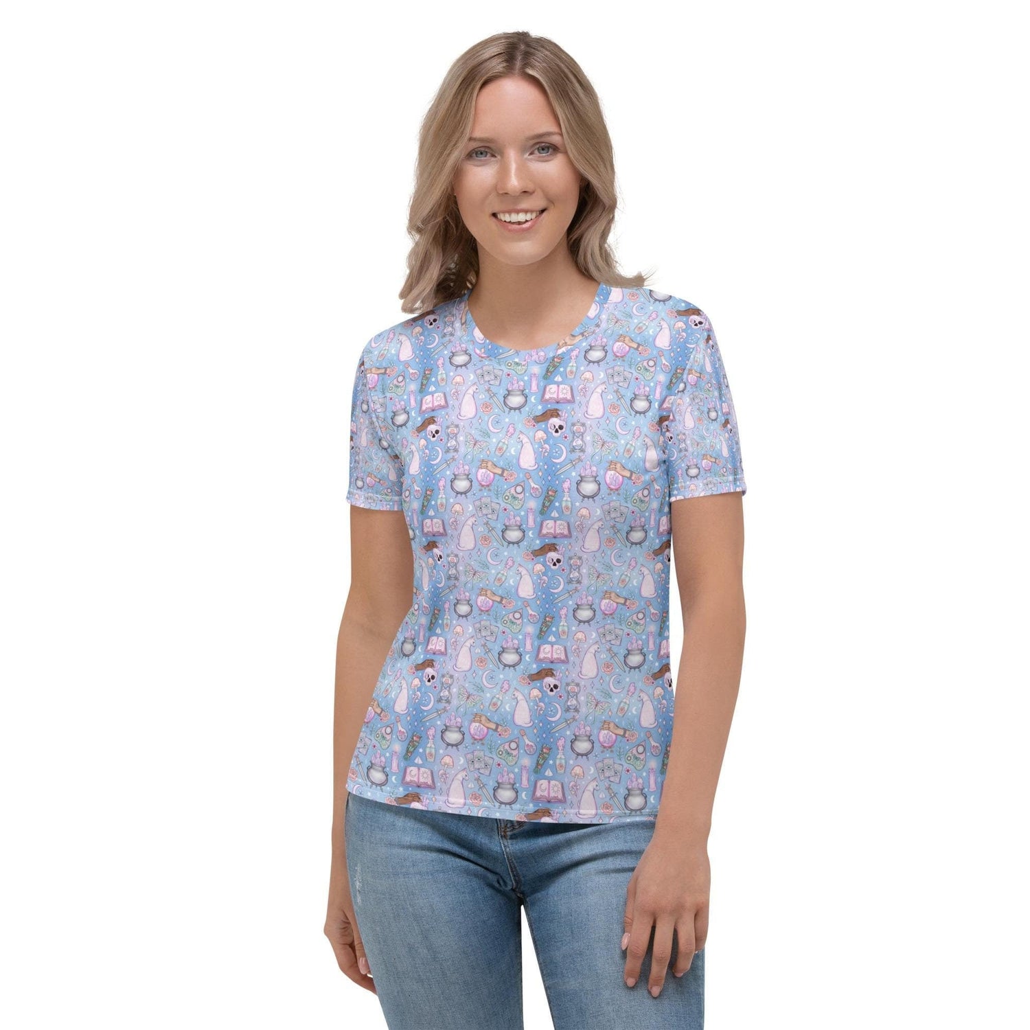 Camiseta de mujer, diseño casual de moda único auténtico de neón azul brillante gótico con bruja mágica colorida celestial, camiseta de mezclilla