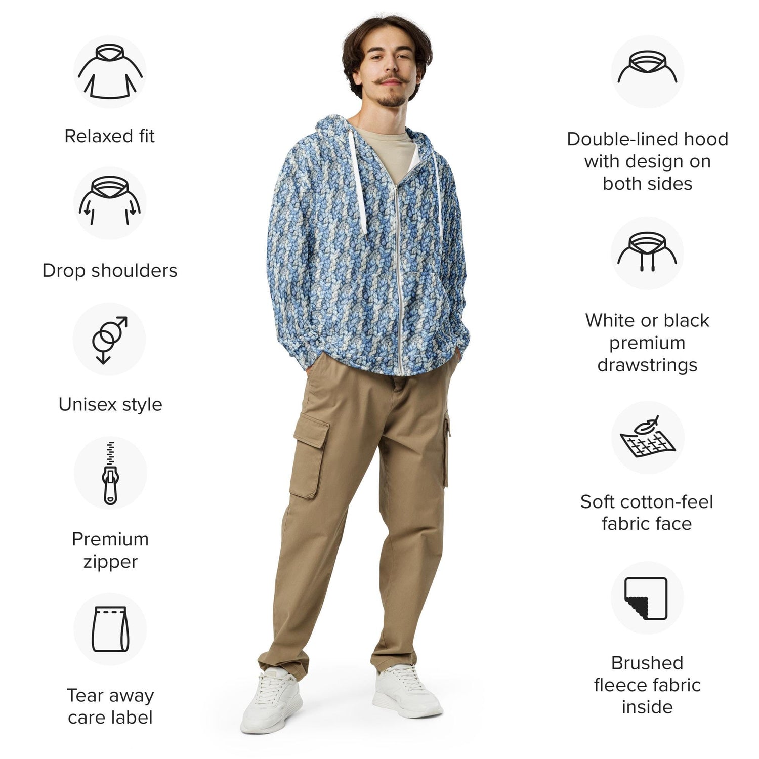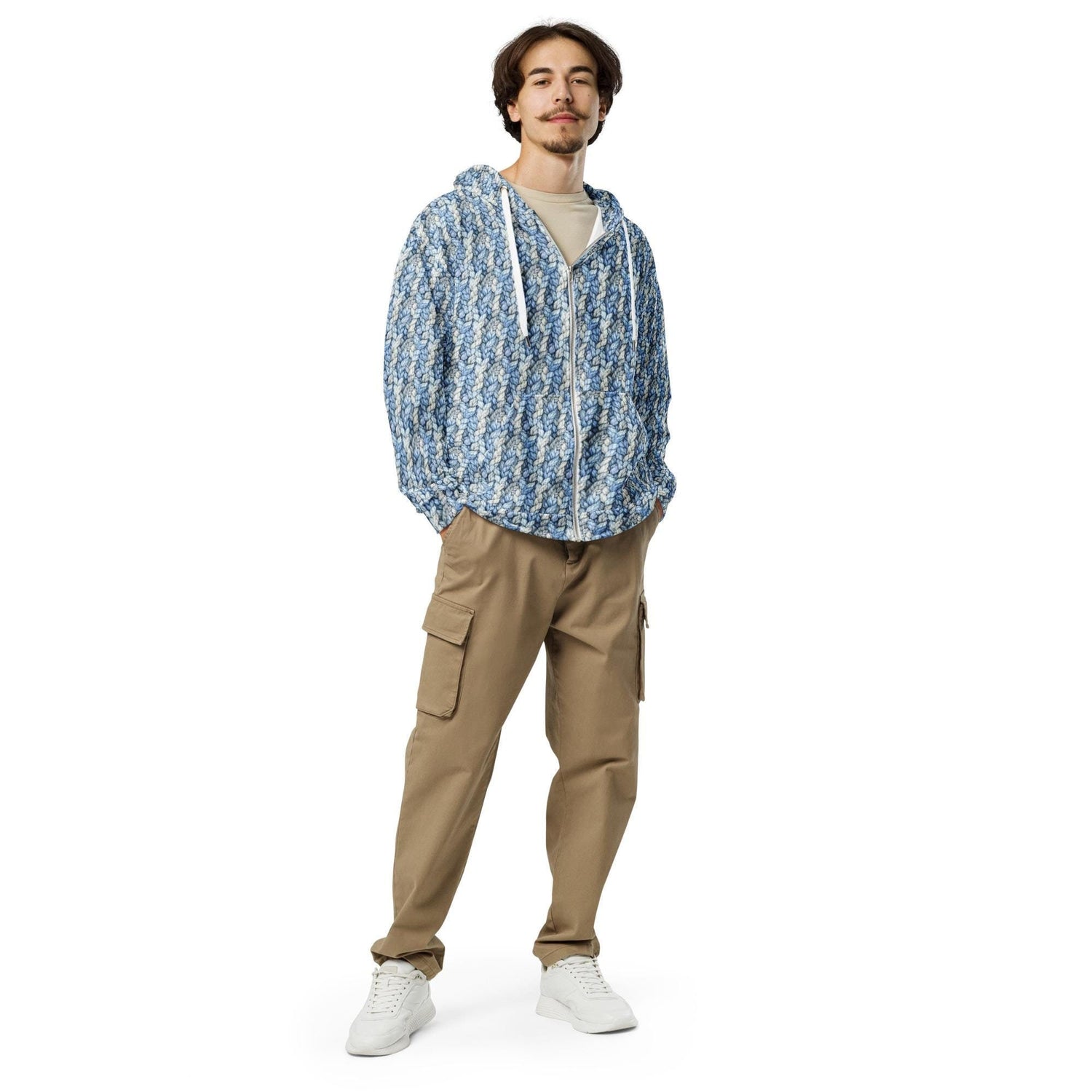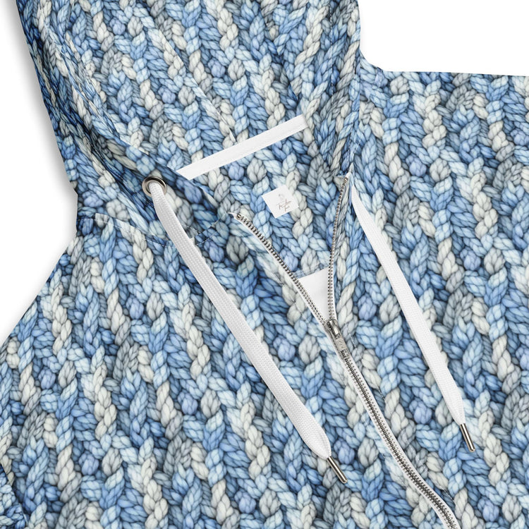 Sudadera con capucha y cremallera con estampado integral para hombre - Sudadera con capucha de moda - Diseño gráfico único de crochet azul - Perfecta para uso diario