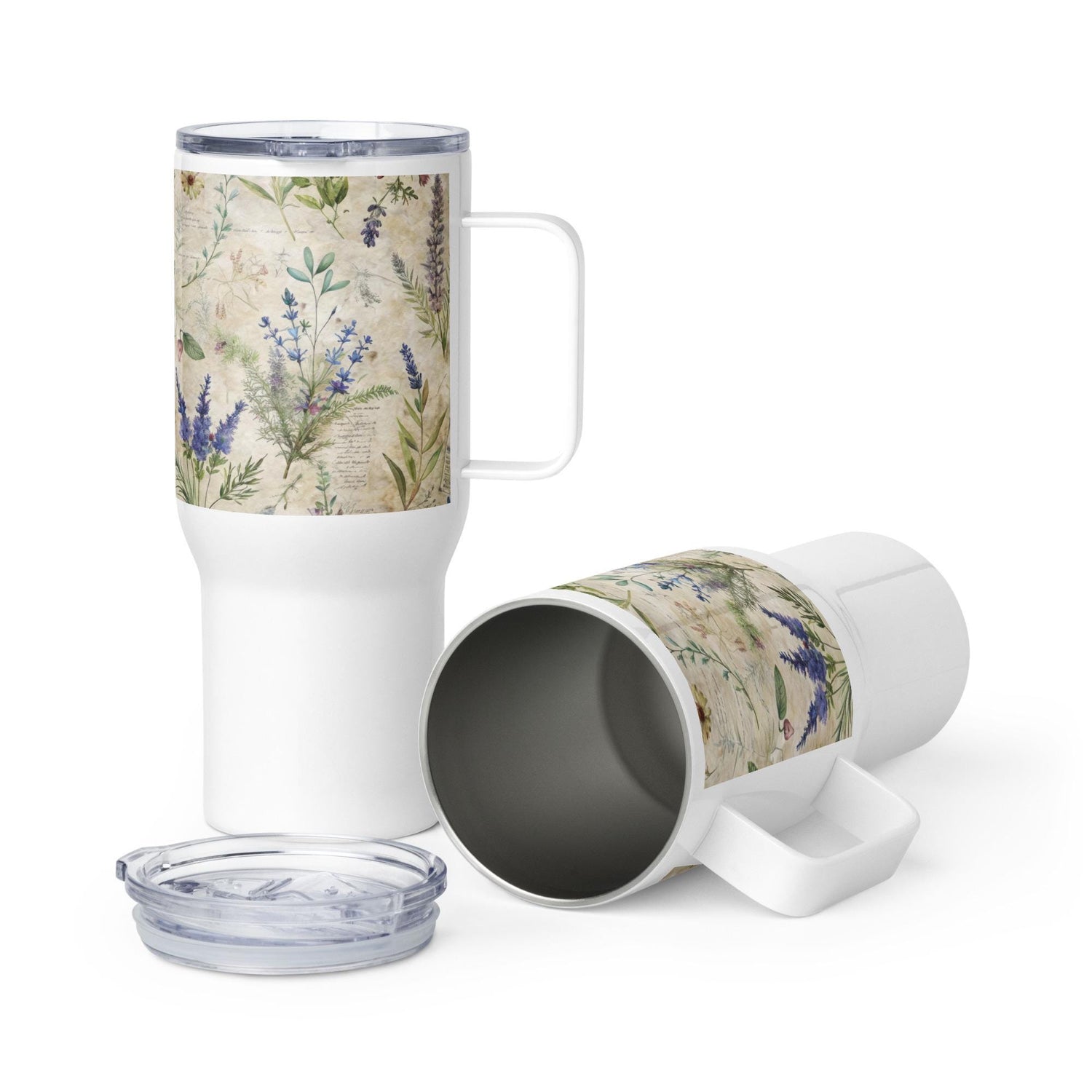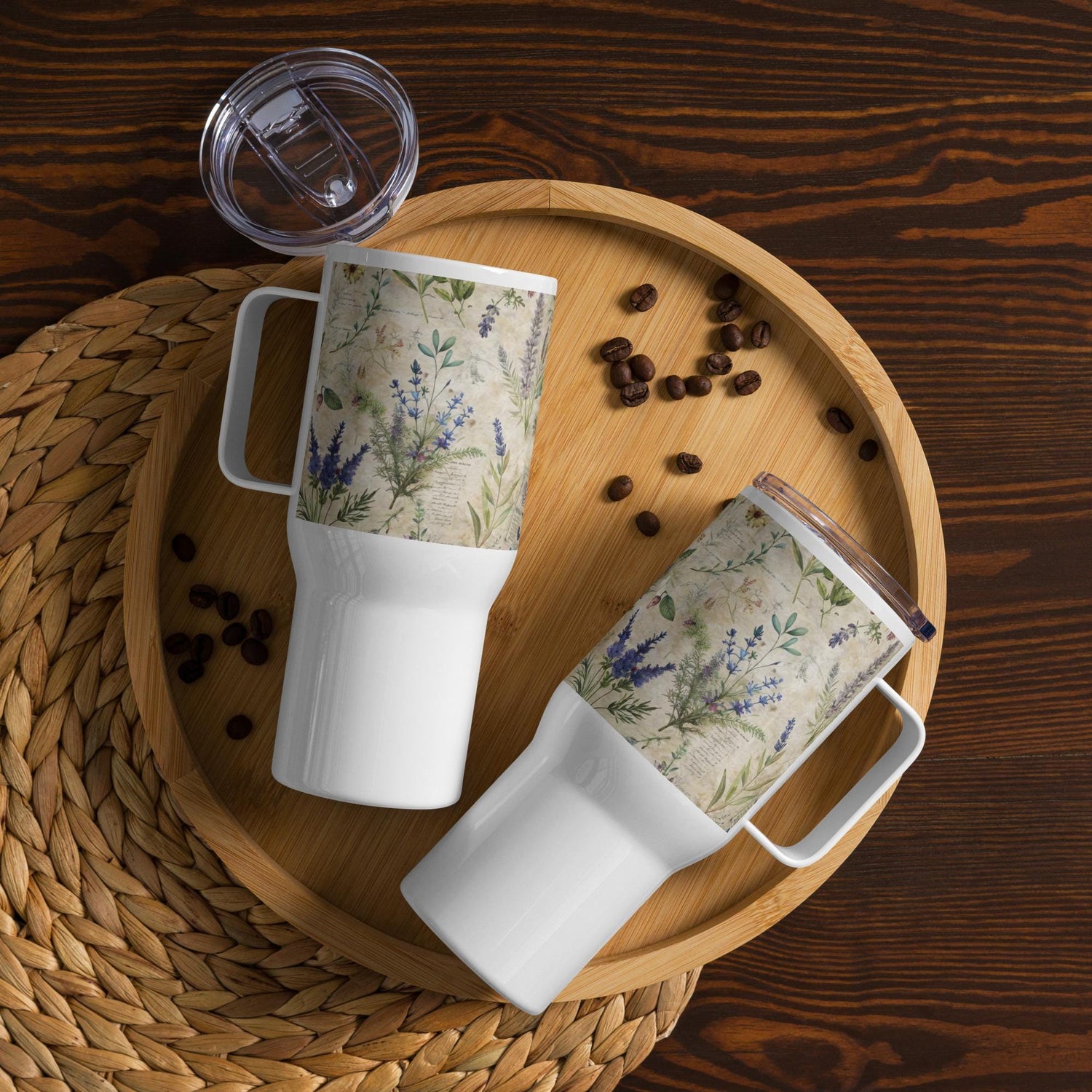 Taza de viaje con asa, diseño con estampado floral de lavanda, ideal para agua, café, té, coche y viaje, ideal para la oficina y la vuelta al cole.