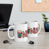 .:Estas tazas de 11 oz (0,33 l) están hechas con cerámica blanca duradera para que las impresiones se destaquen.