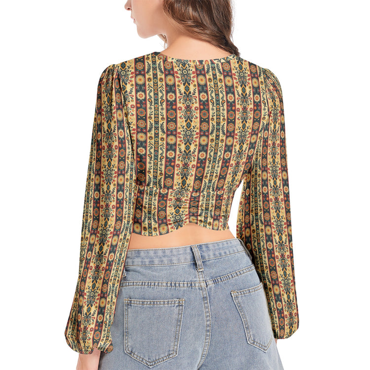 Women's Ethnic Floral Print Pattern Deep V-Neck Lantern Sleeve Crop Top